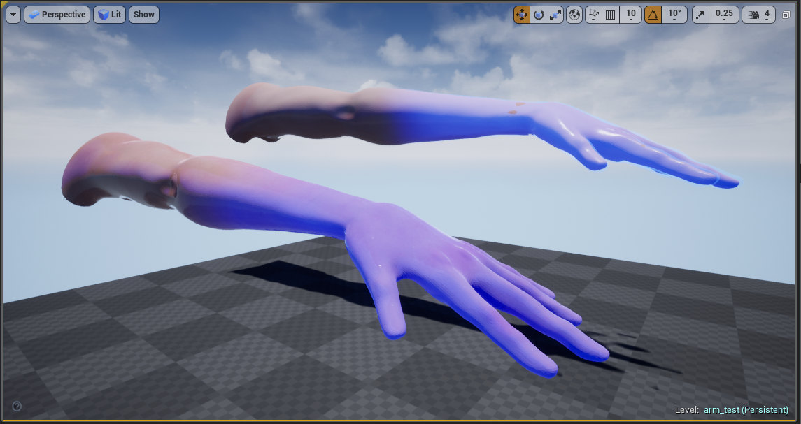 The bottom two images show the simple test materials used on the arms above. On the left is the arm, alone, textured to give the illusion of having a glove. The right is a separate glove texture applied to a different set of geometry.