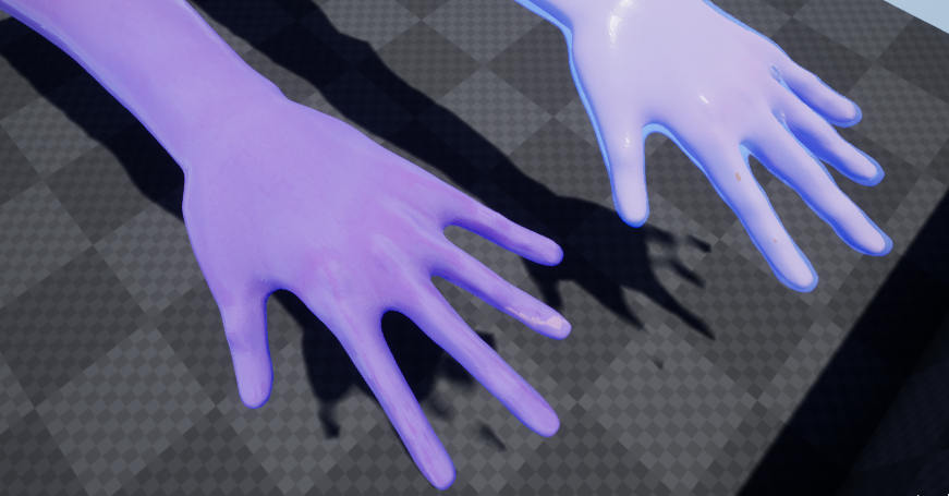 A unique issue I had with Doko’s model was figuring out what to do with her gloves. They’re a transparent, shiny material that had some slight emissive qualities. Realistically, I knew that giving her an actual glove model would unnecessarily add to her polycount, but after trying the two methods out in Unreal Engine, I decided that doing just that was the only way to really get the effect I wanted. By having a second set of arms, I could also add just a slight distortion effect which really pushed the idea of these transparent latex gloves.